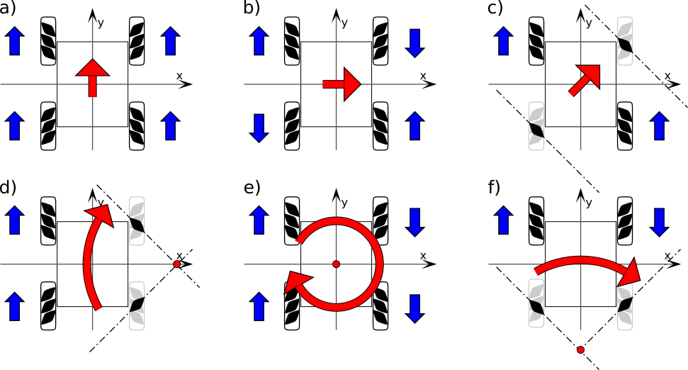 My son said that he wanted to build a robot, so we grabbed a handful of laser-cut construction set pieces and built this. The most exciting feature is probably the Mecanum wheels whose direction of rotation determines which way the robot moves, without any other method of steering. This image shows how this works, with the blue arrows indicating individual wheel rotation direction and the red arrow indicating the robot's direction of travel: